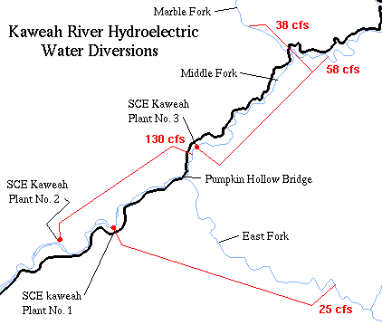 130 cfs is diverted on river right immediately below Kaweah River Plant No. 3 to serve the SCE Kaweah River Plant No. 2 below Dinely Bridge.