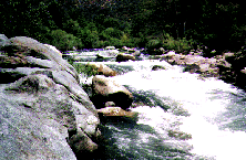 This section is the Classic Kaweah run. The description starts at the traditional historical Put in at Pumpkin Hollow Bridge even though the put in at the bridge has been blocked of in the spring of 1994. Put in below Headwall where the highway comes adjacent to the river. It's best to run this section with someone familiar with the run as some drops are hard to scout and the river splits in several places. The route is usually to the leftmost channel. This section is still runnable below zero on the gauge (less than 400 cfs) although it becomes quite technical and more rocks are visible than water.