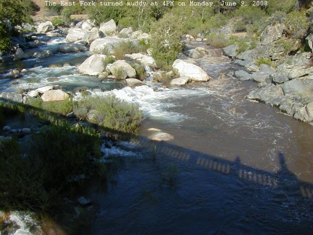 6.2 feet in three hours between 5PM and 8PM. The river started turning muddy at 9PM and by Saturday morning the flow had dropped but the Middle Fork was running brown/green and the East Fork was chocolate brown.