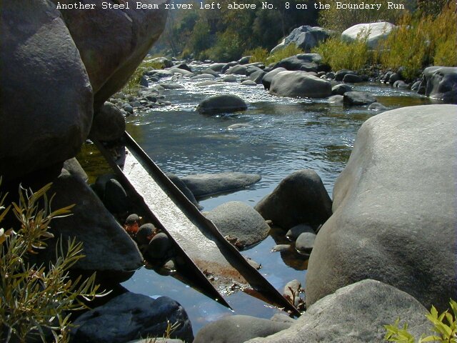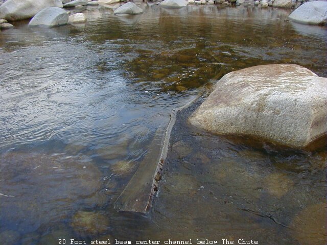 09-11-00 A 15 foot I-beam is wrapped around a large boulder just below the Chute. Prior to the flood of Jan. 1997
