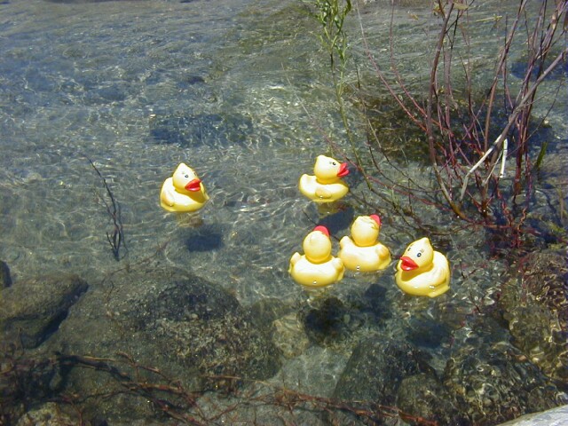 duck race held in early May 2002. The race started with 96 ducks, most of which went nowhere fast and eddied out anywhere and everywhere.