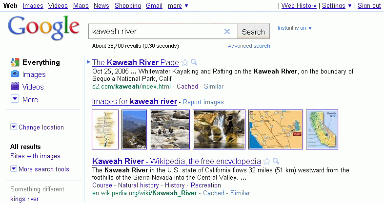 12-01-10 If you Google for Kaweah River you might find that The Kaweah River Page is Number One in Google. This has been the case on and off for many