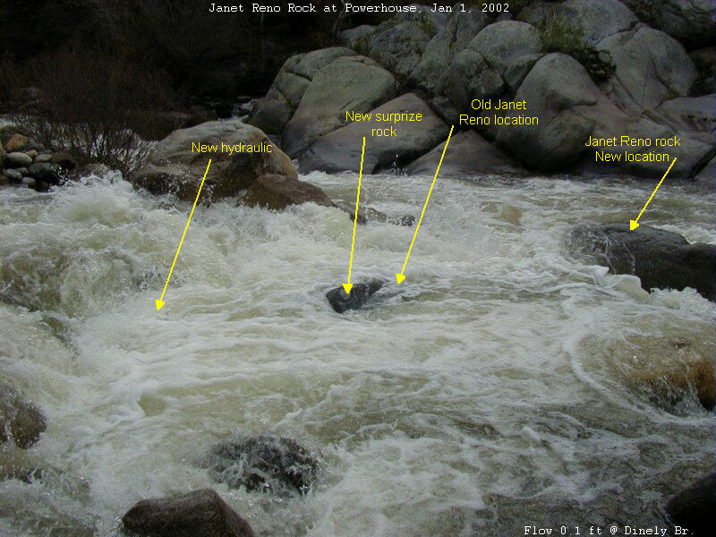 05-01-02 Old but good news. The Janet Reno Piton Rock in Powerhouse has moved downstream 15 feet to a safe and stable position nearly