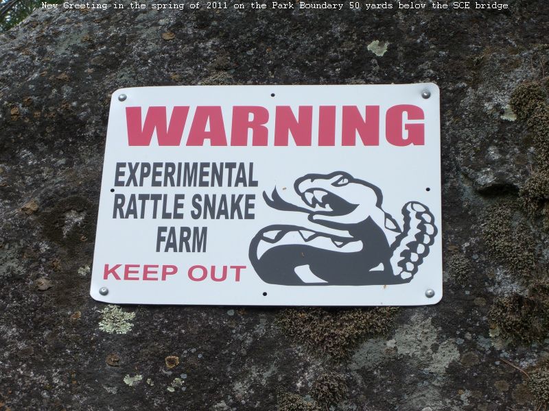 below the SCE bridge with the words: WARNING Experimental Rattlesnake Farm Keep Out. Word has it that the landowner will be building a house on the newly cleared area on a slight knoll